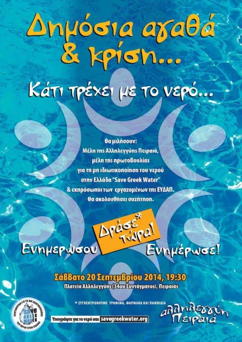 By savegreekwater on 18 Σεπτεμβρίου, 2014Η Αλληλεγγύη Πειραιά προσκαλεί όλους,το Σάββατο 20/09/2014, στις 19:30,στην πλατεία Αλληλεγγύης σε μια ανοιχτή εκδήλωση ,με θέμα”Δημόσια αγαθά και...